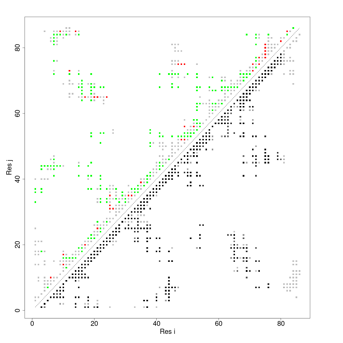 In the case of contact maps we pay attention to 3 things for each contact. 1) The Frustration Information Content (FrustIC, not shown in the figure), 2) the frustration state that contributes more energy to the total FrustIC (upper diagonal matrix) and 3) the proportion of structures relative to the total in the submitted dataset. In our analysis we often pay attention to contacts with FrustIC values higher than 0.5 and that are present in more than 50% of structures.