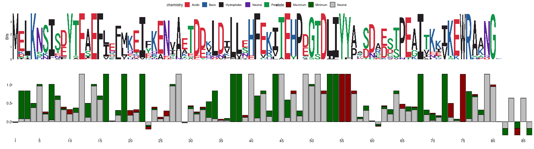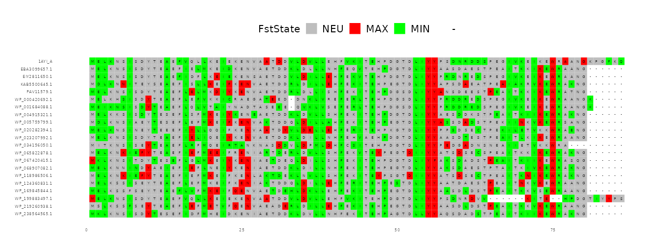 In the previous figure, you can observe a typical sequence logo below which you can find a frustration logo that is derived in the same way. The way to interpret the frustration logo is analogous to the sequence one. Positions in the MSFA with high conservation of their frustration states will display tall bars (maximum theoretical height is log2(3)=1.58) while those with no conservation will be closer to 0 (or even negative values if the distribution of states do not follow what is expected according to the background frequencies used by the algorithm). Each bar will be constituted by 3 stacked proportions that correspond to the amount of information consent that each state contributes to the total height of the bar. We consider a position to be energetically conserved if its associated Frustration Information Content (FrustIC) is higher than 0.5. In the Im7 example we can easily see that Y55 and Y56 are in energetic conflict in a majority of the family members (tall, red bars) and therefore might be functionally relevant (these residues are known to be important to bind Colicin E7). Some other positions seem to be important for local stability, e.g. positions 19, 22, 37, 38, 53 or 54 that correspond to hydrophobic residues that are part of the hydrophobic core of the protein. On the contrary, some positions are not energetically conserved (small bars). This can be accompanied by sequence variability or not. Interpretation of such positions goes as follows. These bars are small because the frustration states distribution in that MSFA column is heterogeneous. This heterogeneity can be accompanied by sequence variability which can be its cause, as well as sequence variability in the contacting residues, the occurrence of nearby insertions or deletions. It can also be possible that positions with high sequence conservation have no frustration conservation. In this case, it might be useful to explore structural conformational variability of the region. This is because disordered or highly flexible regions can have multiple conservations in the static structure with heterogeneous frustration values even when having exactly the same sequence.