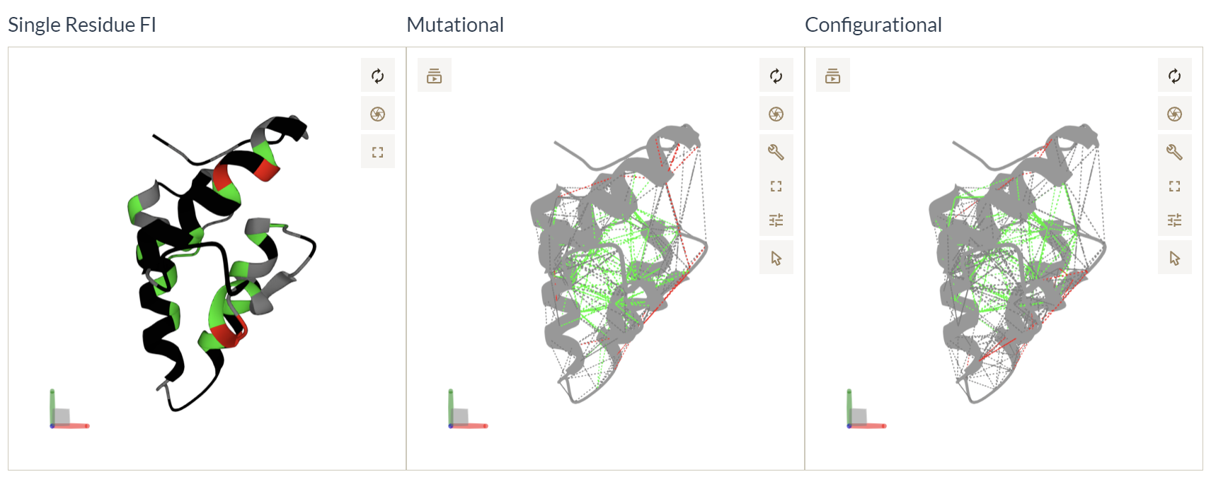 We map residues with FrustIC>0.5 to the structure and color them according to the most informative frustration state in the corresponding MSFA column. Residues with FrustIC<=0.5 (i.e. not energetically conserved) are coloured in black. Similarly, we map contacts from both the mutational and the configurational frustration indexes into the structure. We map contacts with FrustIC>0.5 and that are present in at least 50% of the structures in the submitted dataset. These 3 representations offer complementary ways to analyse the evolutionary constraints that are present in the dataset.
