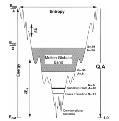 Natural proteins as we observe them today are highly evolved complex systems. Self-assembly and mutual recognition of these polypeptides into defined structural ensembles is a fundamental aspect of the biology of macromolecules, the specificity of which is physically captured by the "Principle of minimal frustration" [2]. This principle states that the energy of the protein decreases more than what may be expected by chance as the protein assumes conformations progressively more like the ground (native) state. In other words, there is a strong energetic bias towards the native basin that overcomes both the asperities of the landscape and ultimately the entropy of the chain. When energetic frustration is low enough, the native energy and folding entropy primarily compete. Since these mainly depend on protein topology, topology becomes a key factor governing folding reactions. It has been shown that the structures of transition state ensembles [3,4], the folding rate [5], the existence of folding intermediates [6], dimerization mechanisms [7], and domain swapping events [8] are often well predicted in models where energetic frustration has been removed and topological information of the native state is the sole input. Still, inhomogeneity in the native contacts energetics, non-native interactions and the residual local frustration present in the native ensemble do contribute to the functional characteristics of proteins, 'molding' the roughness that underlies the detailed protein dynamics [9,10].