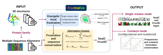 The calculation of evolutionary frustration based on the single residue FI which can analogously be applied to contacts as well. Given a Multiple Sequence Alignment (MSA) and the corresponding structures for each sequence contained in the MSA, we can map local frustration values from the structures to each aligned residue within the MSA. Evolutionary frustration refers to the quantification of this conservation by calculating the Information Content (IC) for each MSA column, using the Shannon information content formulas: