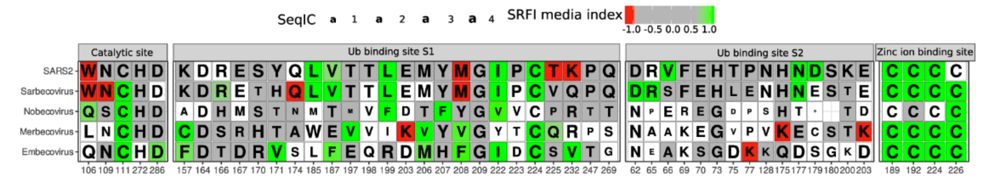 MSFA showing FrustraEvo results for selected functional domains in PLPro. Cells that are colored correspond to FrustIC > 0.5, while white cells mean that FrustIC ≤ 0.5. Color of the cells represents the median SRFI value computed with FrustratometeR (see methods for frustration states definitions). The amino acid identities correspond to the consensus sequence, and the size of the letter is proportional to SeqIC.